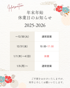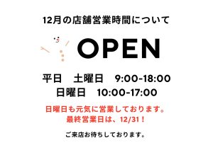 年末年始の店舗営業時間と配送につきまして、下記のとおりご案内させていただきます。